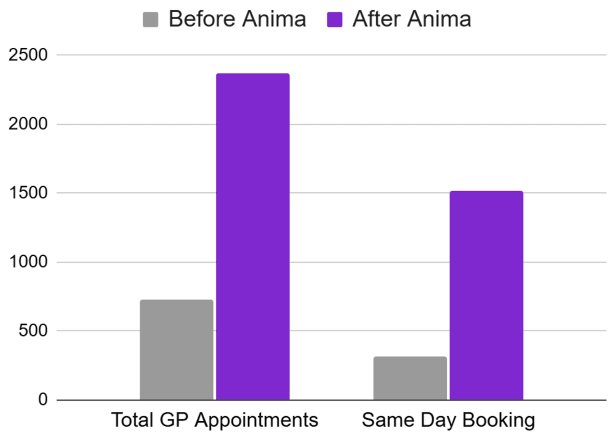 Graph showcasing 224% increase in total GP appointments and 380% increase in same day bookings after implementing Anima.
