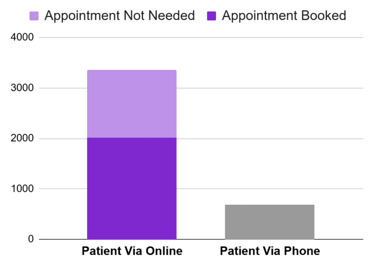 Significant Shift Online: In January, out of 4,040 total patient contacts 3,355 (83%) submitted their triage request online through Anima. Dramatically reducing the burden on phone lines and front desks, with just a remaining 685 were handled via phone or face-to-face across two branches.